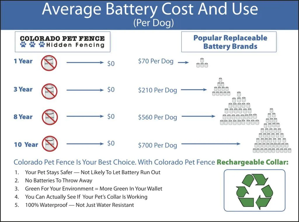 Colorado Pet Fence features containment systems that use Rechargeable Collars. This extremely popular feature can save you up to $840 in battery costs over the average lifetime of each dog in your household. This enables Colorado Pet Fence to offer the “Lowest Cost of Ownership” of any professionally installed containment system in the Denver/Front Range Area. (Our competition charges up to $70 per dog / per year for their Battery Plan. Over a 12 year average lifespan of dog, this ends up costing you about $840). Let’s face it, the only reason that franchises still use batteries for their collars is because it s a huge profit center for their business. Plain and simple, there is absolutely no longer any need for batteries with these types of systems. Batteries for dog collars are a thing of the past…unless you enjoy throwing your money away every couple months!